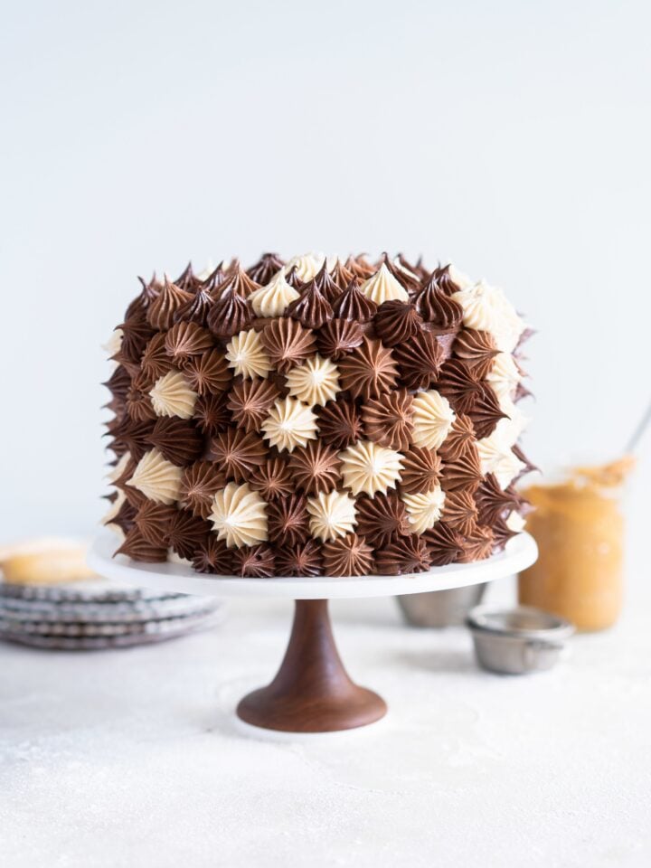 Banana Layer Cake with Salted Caramel Filling and Peanut Butter Swiss Meringue Buttercream