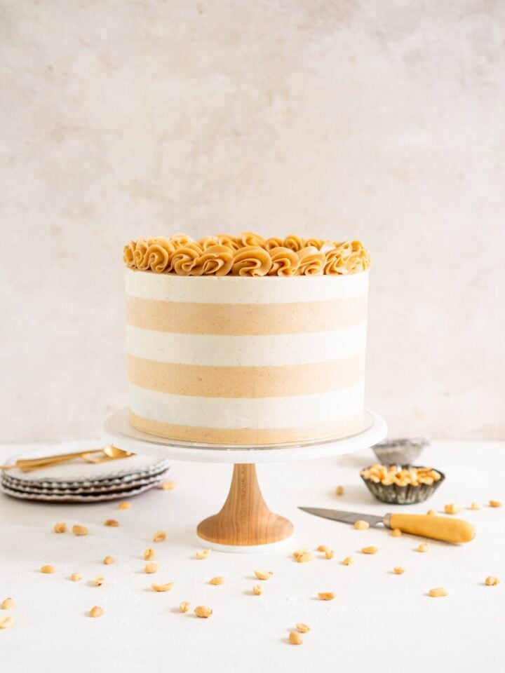 Banana Layer Cake with Salted Caramel Filling and Peanut Butter Swiss Meringue Buttercream