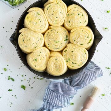 Fluffy brioche is rolled out thin, then spread with a cheese sauce filling, sprinkled with spring onion and chives, and rolled up into a tight spiral. It is then cut up into buns, snuggled into a skillet, and baked to golden perfection. The perfect savoury bun!