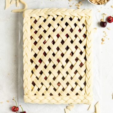 - In a large bowl, combine the cherries, sugar, tapioca starch, and salt. Transfer to the pastry lined sheet pan. Top with lattice strips. Trim back any overhanging pastry, and either crimp the edge or add a braided border, fixing down with a little egg wash.