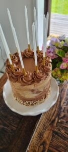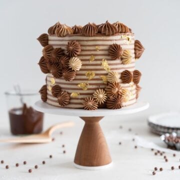 This has to be one of the best cakes I have ever made. I took a bunch of my favourite things, and combined them into one perfect (to me) cake. Fudgy brownie cake layers, sandwiched with chocolate hazelnut filling, and a silky mocha German buttercream. I finished it with some fancy gold leaf and buttercream stripes (more on that new technique later), and what has become somewhat of a signature move from me - some french star tip piping. The flavours compliment each other perfectly - the chocolate hazelnut filling is so delicious against fudgy cake layers and silky silky mocha German buttercream. If you haven’t tried German buttercream you should - I love that you can infuse it with whatever you like, in this case some strong coffee. I whipped some melted chocolate into it, and it became almost like room temperature ice cream - silky and amazing. So tempting to eat with a spoon, but even more magical layered into the cake.