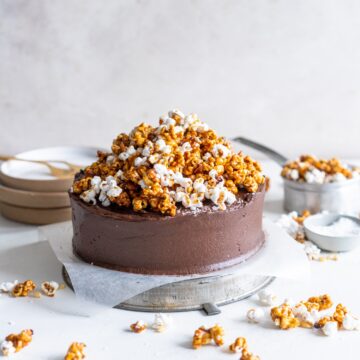 - Spread the frosting over the cooled cake, smoothing top and sides. Top with the honey caramel corn (you will not use it all, but the rest is so good for snacking on)