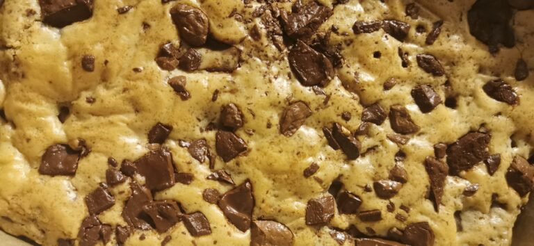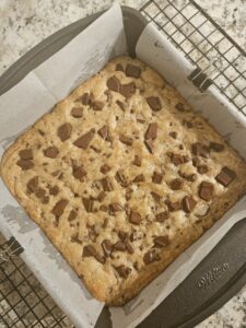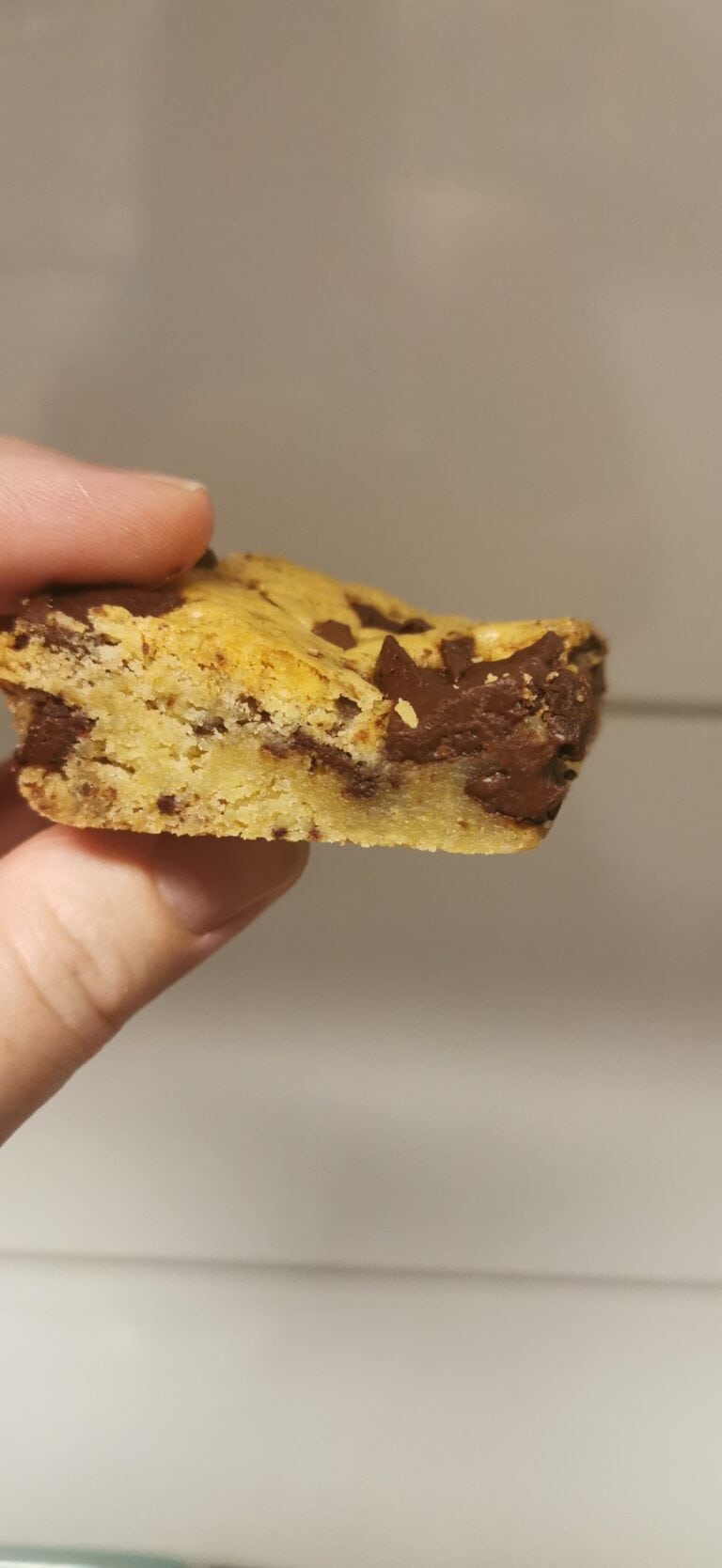 When the chocolate chip bar is baked, the surface will be set and lightly golden brown, and the edges of the cookie bar will be set and slightly firm. I prefer to underbake my cookie bar rather than over bake it, but if you like super crunchy edges you can bake it for a little longer.