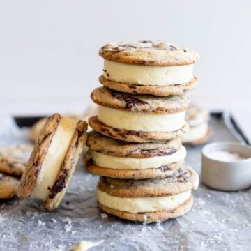 These Chocolate Chip Cookie Ice Cream Sandwiches are the perfect treat. Thin and crispy olive oil chocolate chip cookies are sandwiched with a smooth and creamy olive oil ice cream. Cookie ice cream sandwiches are fun and easy to make and the olive oil ice cream recipe is amazing on its own.