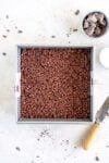 - Grease an 8" (20cm) square pan and line with a piece of parchment that extends over the ends slightly to help remove the slice once set.