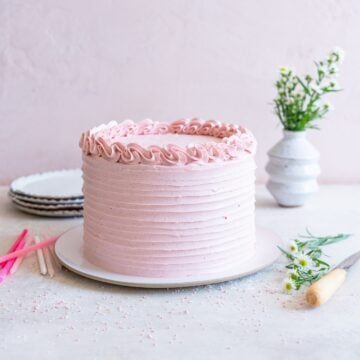 I love the addition of freeze dried strawberries to the buttercream, so delicious! I decorated mine with a sprinkle of freeze dried strawberry chunks in the center along with a selection of pink and white sprinkles. Looked so pretty!