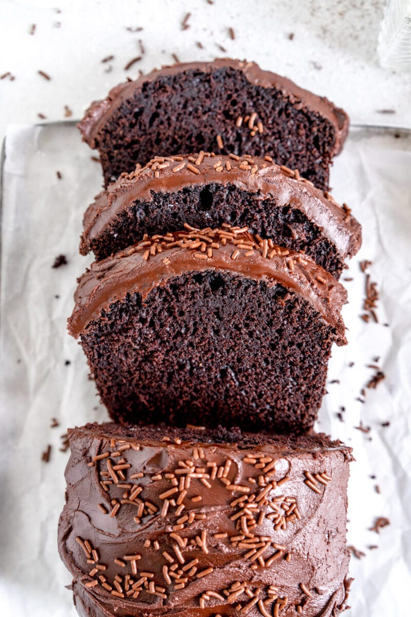 This homemade chocolate loaf cake has terrific texture and moistness because it's made with olive oil, rather than butter. Top with chocolate frosting (optional)!