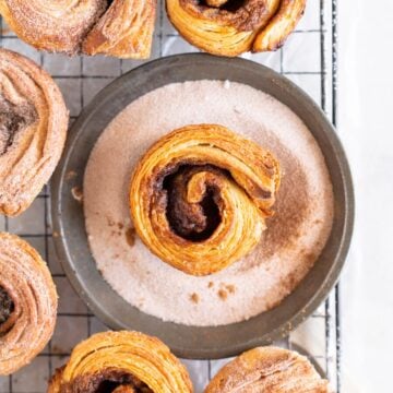 Cinnamon and Cardamom morning buns. These buns are flaky and sweet, with layers from the lamination. The base laminated yeasted danish dough is a fun, easy project, and these morning buns make a perfect breakfast.