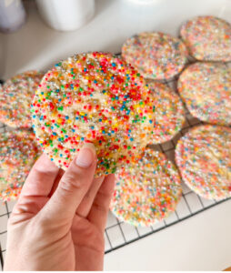 These are so easy to make they whip up in no time. What a great base for your favorite add ins. I did put sprinkles in it for the kids and they loved them. I had no baking soda on hand so I used a teaspoon and a half of baking powder. Such a soft cookie. Definitely my new go to.