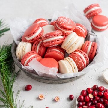 French macaron shells are filled with white chocolate swiss meringue buttercream and fresh cranberry sauce filling, for the perfect festive macaron. These gluten free treats are easy to make for a crowd.