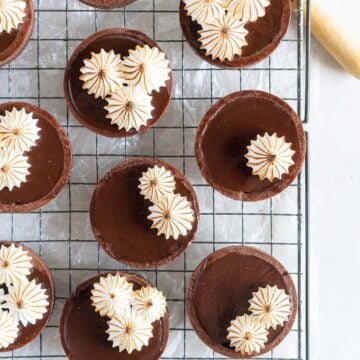 - Pipe blobs of the swiss meringue onto the top of each tart - I only did a few on each because I liked how it looked, but they would look great totally covered in meringue too. You could also use an offset spatula, dollop it on, then smooth it off. Torch if desired.