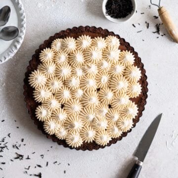 - Remove the chilled tart from the fridge. Pipe blobs of earl grey cream over the surface of the tart.