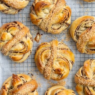 To me, these are the perfect variation on the swedish bun. Because there is no sugar in the filling, they aren’t super sweet, but the flavour of tahini and chocolate play beautifully with the sesame on top. They are easy to make but look fancy, and I love how fun and pretty the twisted dough looks. Enjoy! x