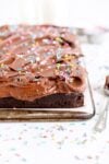 - Add the frosting to the top of the cake and swirl on with an offset spatula. Add sprinkles if using. Place the cake briefly in the fridge to help the frosting set, then cut into pieces.