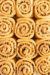 - Starting with a long side, roll up into a tight spiral. Cut the log into two pieces and place them side by side on a sheet pan lined with parchment paper and lightly sprayed with cooking spray. Lightly cover the dough logs with plastic wrap, and transfer to the freezer for 20 minutes in order to firm up slightly (this helps give a neater cut - if your dough is chilled you can skip this step).