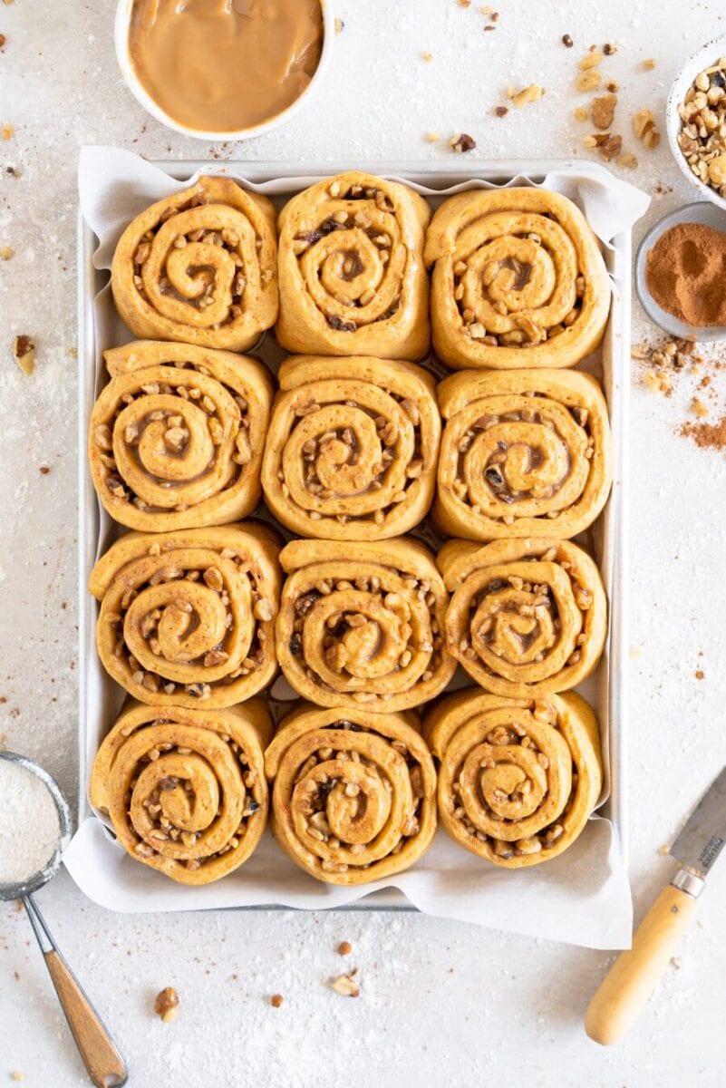 These make the perfect breakfast, so you can easily make them ahead of time. Make the Dulce de Leche in advance, and then prepare the dough as written. Then, instead of proofing them at room temperature, cover the bowl and leave in the fridge overnight, where it will slowly rise. This means that it will be ready to roll out into your carrot cake cinnamon rolls in the morning, and then all you have do is assemble and bake!