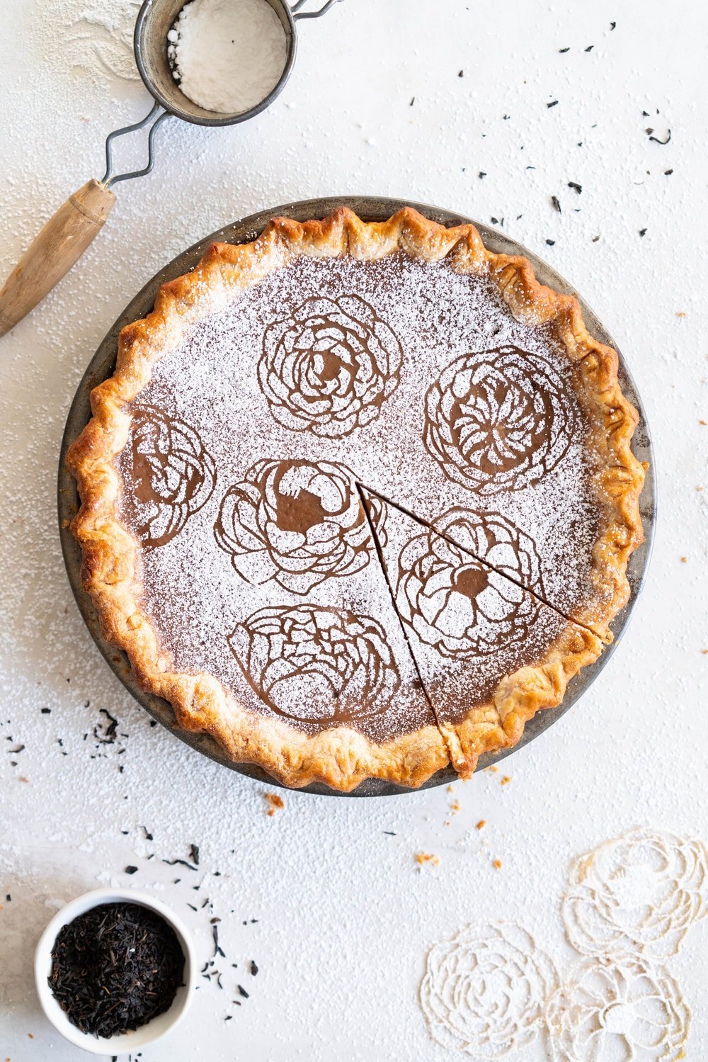 If you haven’t had a sugar pie before, now is the time for that to change. They are a custard pie, but, instead of being egg set like a pumpkin pie (and therefore very susceptible to cracking), a sugar pie is flour set, meaning that it bakes up silky smooth and flat every time, and you don’t have to worry about overbaking and running the risk of cracking. It’s super easy to make - you literally just whisk everything up and pour it into your parbaked pie shell. Erin’s version in her book is delicately spiced with nutmeg, but I had to test out my Earl Grey theory (if you can infuse it, you can add earl grey) on the recipe, and it turned out amazingly. Fragrant Earl grey custard is spiked with vanilla bean, and finished with a hefty dusting of powdered sugar. To me, it is perfect.