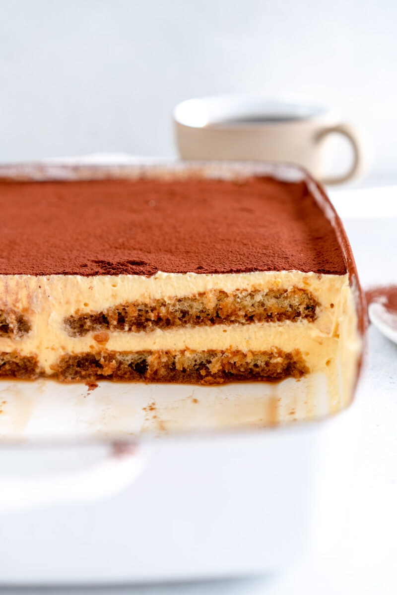 The thing that I love the most about tiramisu over other dessert recipes is how easy it is to make, but also how great it is to make ahead of time. You can prepare it the morning of or the day before in under 30 minutes, and have a super impressive dessert just hanging out in your fridge ready to go!