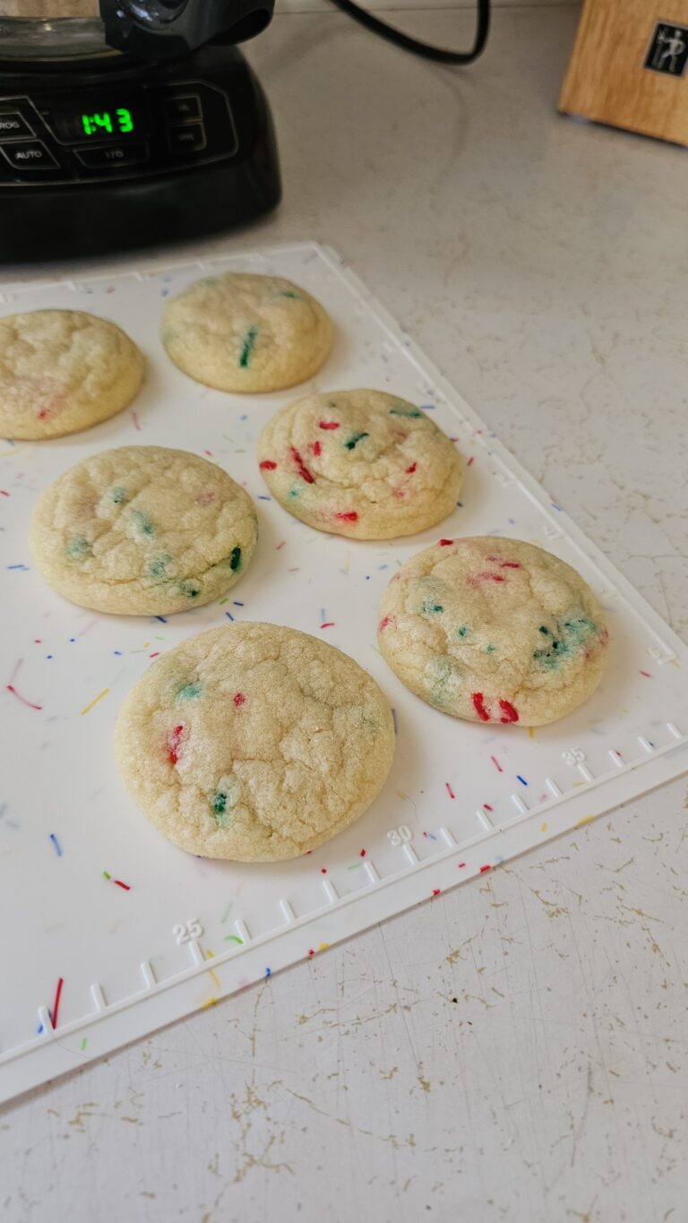 Unable to get the right size even though I used a weighted scale with g’s. Very thin and big, nothing like I expected. A thoughtful American translated your Chocolate Sprinkle cookies into oz and cups and they came out perfect. Hoping some one does that for these Confetti Cookies! Until then, I guess I would not remake.