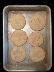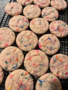 Funfetti Cookies are best stored in an airtight container at room temperature. Then, if you want to, you can freeze them once baked in a ziploc bag and defrost at room temperature before eating. Sometimes I like to warm the cookies up in the microwave for 10 to 15 seconds before eating for a bit of a warm cookie situation.