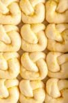 - Shape the garlic knots. To form the knot, shape the dough into a “U” shape. Cross one end over the other - you will have a piece that is on the top and a piece that is on the bottom. Bring the bottom piece of dough up and tuck it through the hole (the bend of the U). Then, take the top piece and wrap it underneath to meet the other piece of dough. Press them together lightly and shape the dough into a knot. (See video for instructions on how to do this). I suggest practicing with one first until you have the hang of it!