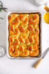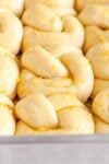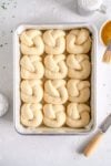 - Rise the garlic knots. Arrange the buns evenly spaced in the pan - I like to arrange them all in the same orientation within the pan. Cover the buns either with a lid, or some lightly greased plastic wrap. Leave the buns to rise again for about 45 to 55 minutes. You want them to puff up and double in size, and when you press lightly on one, it should leave a small indentation that doesn’t quite spring back. See images for how they look just after rolling and then risen. Remember that rising time depends on your environment so go by how the dough is looking, rather than a rising time.