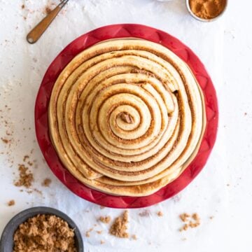 I was super inspired by the pie dish to make this giant cinnamon roll! This would be the perfect thing to make for a Thanksgiving or Christmas morning breakfast - the dough can be made the night before and given an overnight rise, and then all you have to do in the morning is bake it up and add your cream cheese frosting and you have a super gooey, perfectly sweet breakfast that is amazing for feeding a crowd.