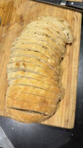 This ciabatta went well with our soup dinner, and next morning we had it topped with scrambled eggs & bacon. The texture’s great and it’s easy to prepare! My kids gobbled it up and asked for more!