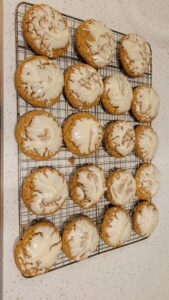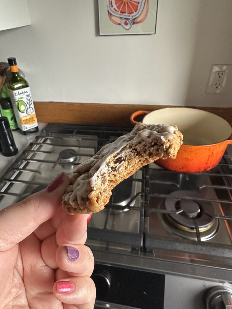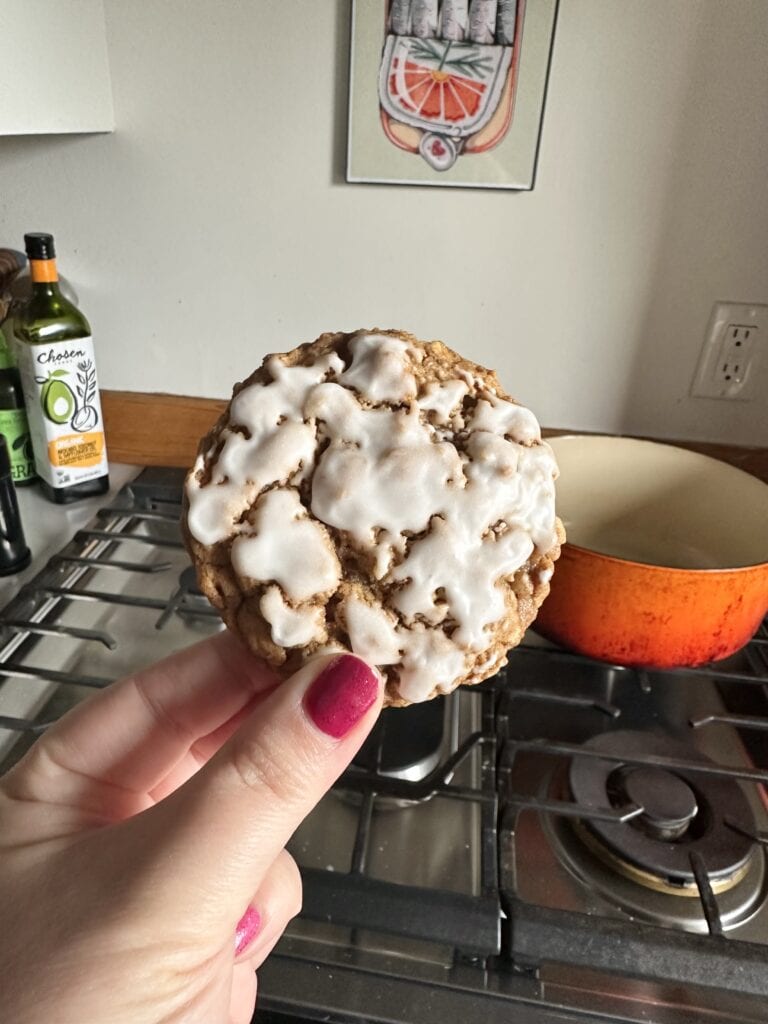 This iced oatmeal cookie recipe makes 10 cookies. Feel free to scale the sizing if you like, but I tested a bunch of sizes and the 55g dough ball is the best size to me, so you do you here but I have warned you!