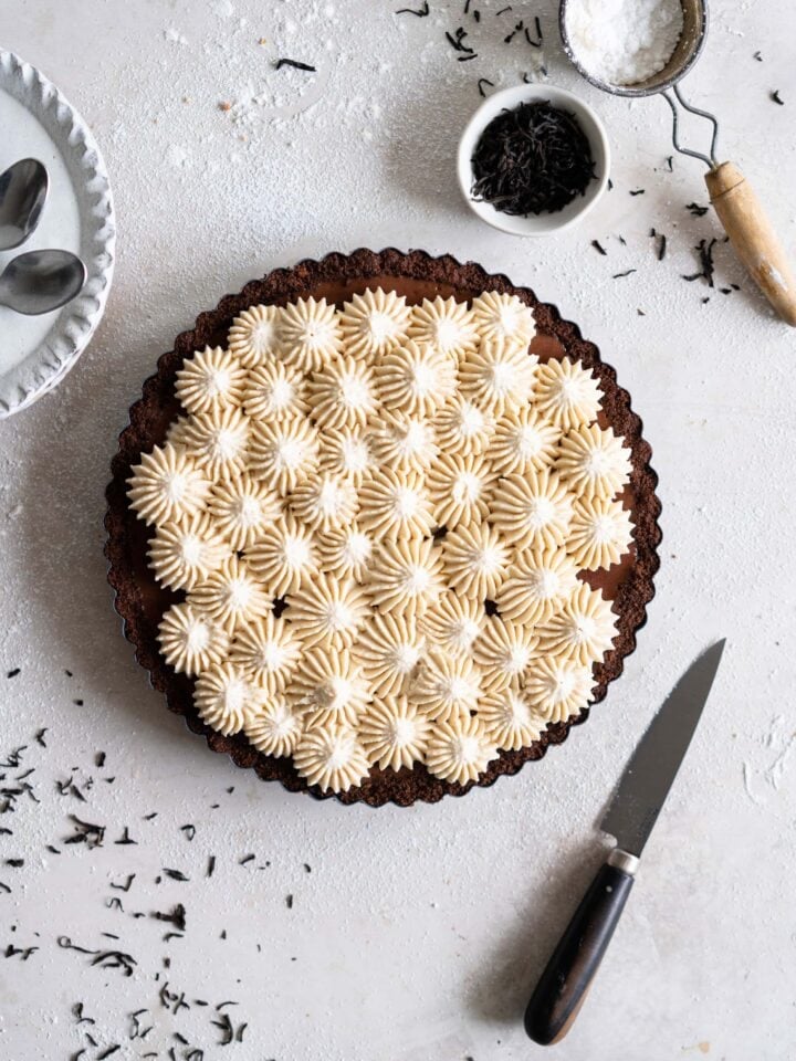 Dark Chocolate Salted Caramel Ganache Tart with Chocolate Graham Cracker Crust and Earl Grey Mascarpone Whipped Cream