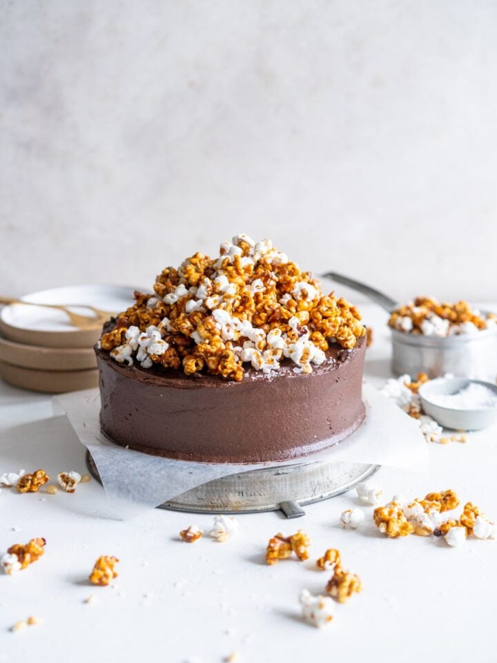 Chocolate Buttermilk Cake with Chocolate Cream Cheese Frosting and Honey Caramel Corn