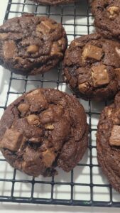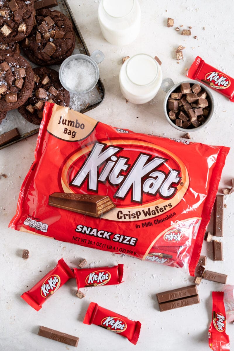 I know Halloween will look a wee bit different for a lot of us this year. This recipe captures all the fun things about tiny candy bars, and pops them into a cookie! I started with a chocolate base, added in some chocolate morsels, and then mixed in a whole lot of chopped Kit Kat bars.