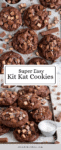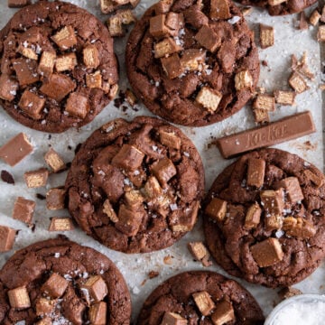 These Kit Kat Cookies are perfect for using up Halloween candy. They are soft and chewy in the center and slightly crunchy around the edges, and are filled with chocolate chunks and chopped Kit Kat.