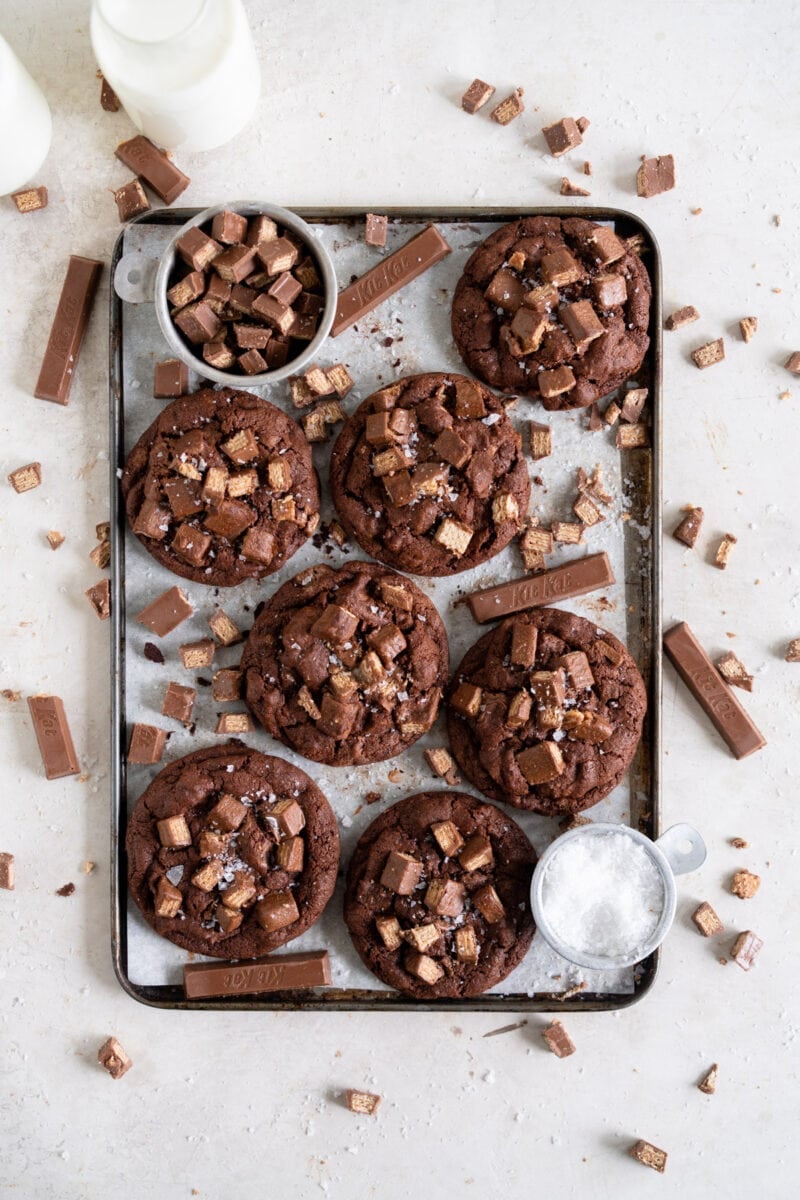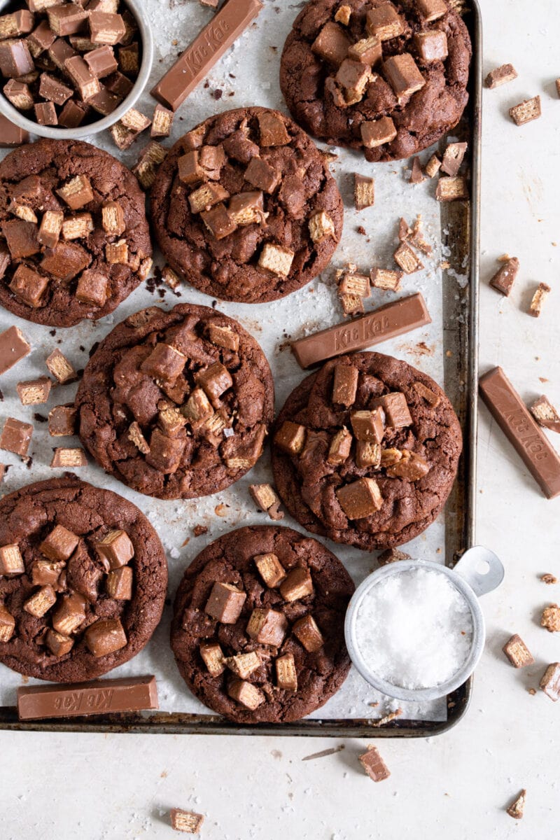 The chocolate gives the cookie a super delicious gooeyness, and then the Kit Kats are crunchy from the wafer and sweet from the milk chocolate coating. I loaded up the cookies with them and made them large bakery style. I then finished them some more chopped Kit Kats and some salt.