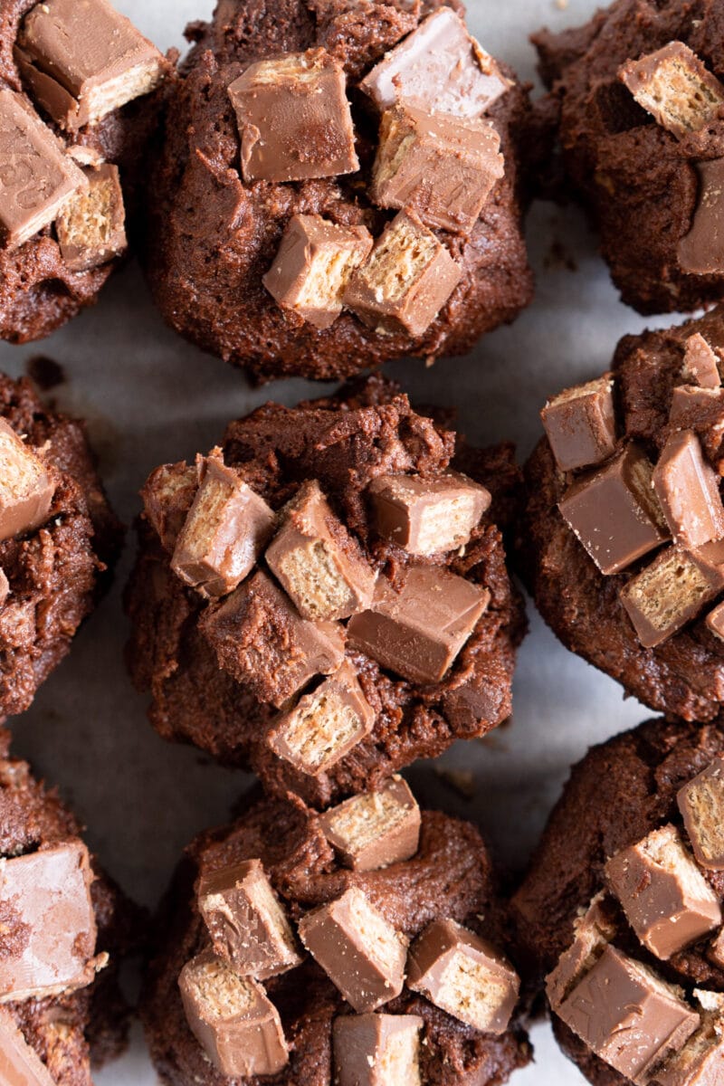- I added some extra chopped Kit Kat on the tops of these both before baking for crunch. I then added some extra on top after baking if they looked like they had any bald spots!