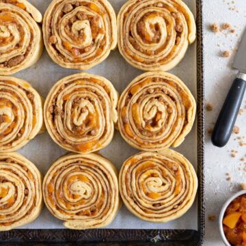 I had some extra brown butter streusel left over from these pops, and a big bag of peaches hiding in the fridge, so I knew I wanted to do a peach streusel spin on these rolls. I kept it pretty simple, swapping out the white sugar for brown in my go-to brioche dough, and adding just a touch of cinnamon. I laminated it with an easy cinnamon and brown sugar mixture. I then made a quick compote from the peaches (highly suggest doubling this if you have extra peaches as it’s amazing on everything), which I layered into the dough along with the streusel. The sweetness of the peaches and the toastiness and crunch of the streusel is the perfect combination, and pairs so well with the flaky, spiced brioche rolls. I finished them off with a quick powdered sugar and heavy cream glaze, which is absolutely optional, but gives that bakery style glazed finish which I just can’t ever resist.