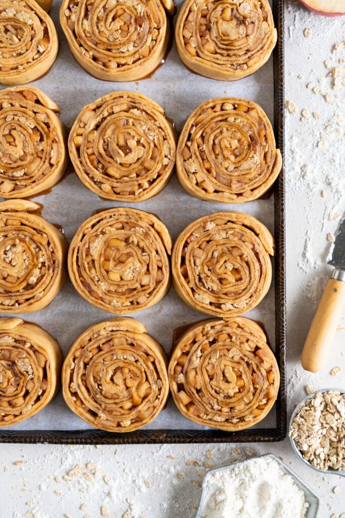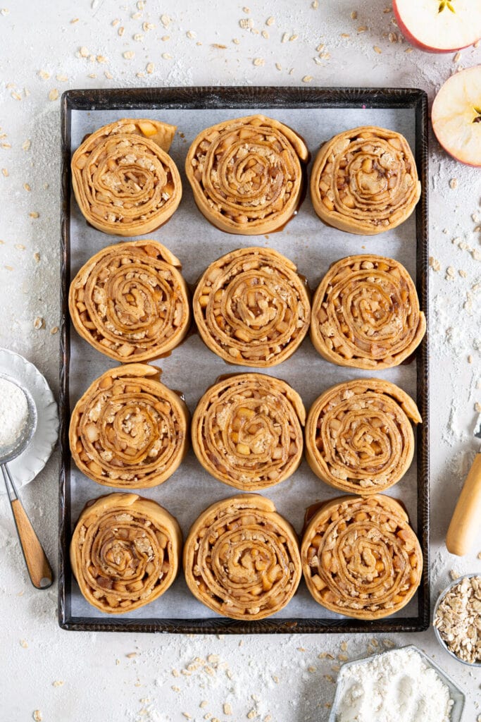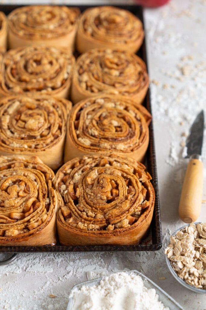 The original buns I did had a peach compote and a brown butter streusel. It was great for summer. However, I also wanted a variation that could be made when peaches aren’t in season, and landed here on these apple ones. I cooked down some apple with some brown sugar and spices. Then I sprinkled it over the dough, and mixed up a super quick oaty streusel, which gave a really nice crunch and some chewy texture from the oats. I love both versions equally. You can mix and match the fillings if you like. I kept the dough and assembly technique just the same.