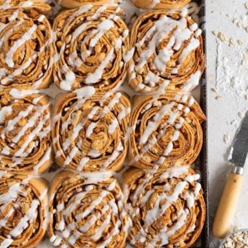 - Lightly brush with butter, and sprinkle with half of the cinnamon sugar mixture. Fold into thirds like a letter, then roll out again into a 16”x26” (40cmx66cm) rectangle. Brush again with butter, and add the remainder of the cinnamon mixture. Arrange the apple evenly over the surface of the dough, then sprinkle over the oaty streusel.