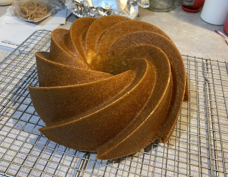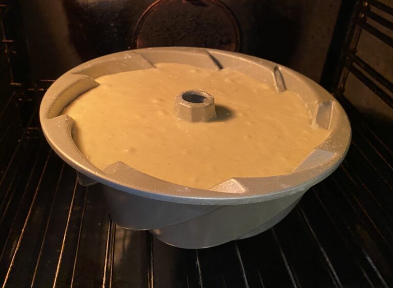 For the second time I’ve done it in a NordicWare 10 cup Bundt pan and it’s come out perfectly. I scaled the recipe by 1-2/3 (so 5 eggs) and it filled the 10 cup pan well. I buttered and lightly flour dusted the pan, let of cool for 15-20 minutes then flipped it out with no sticking.