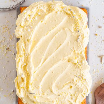 Fluffy lemon yogurt cake is topped with a punchy, silky lemon curd Swiss meringue buttercream. This sheet cake is perfect for feeding a crowd