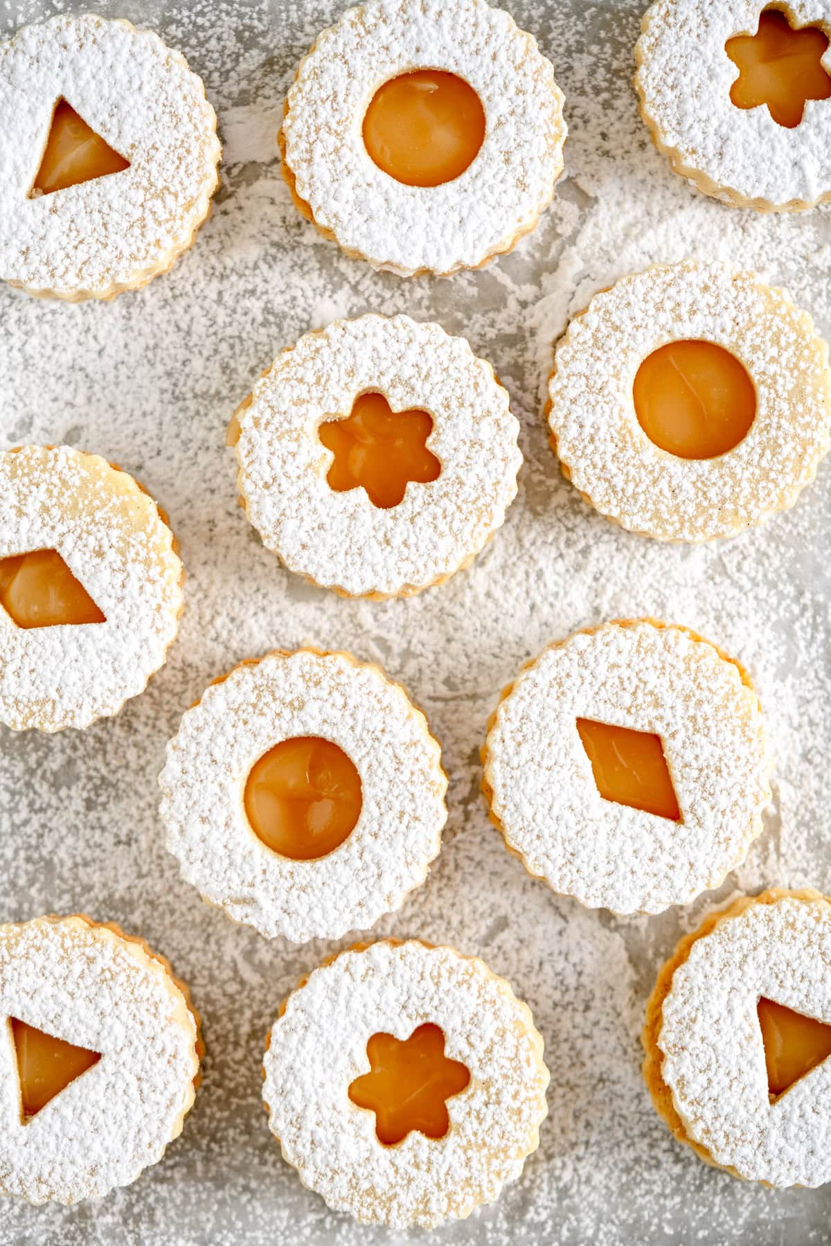 - To assemble the cookies, dust powdered sugar over the 'tops' of the cookies (with the cut-outs). Add jam or filling of your choice to the bottom halves, spreading to just before the edges to allow for some squishing out when you press them together. Have the 'good' side of the cookie facing out (add the filling to the side that was against the cookie sheet)