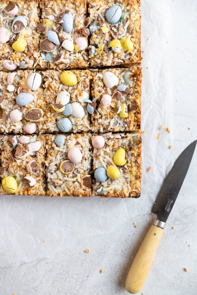 Hi hi! Just popping in to share the recipe for these mini egg magic bars with you! Magic bars are often also called seven layer bars, and consist of a base with a condensed milk topping, filled with all sorts of bits and bobs. This easy magic bar recipe can be made with whatever candy you have on hand.