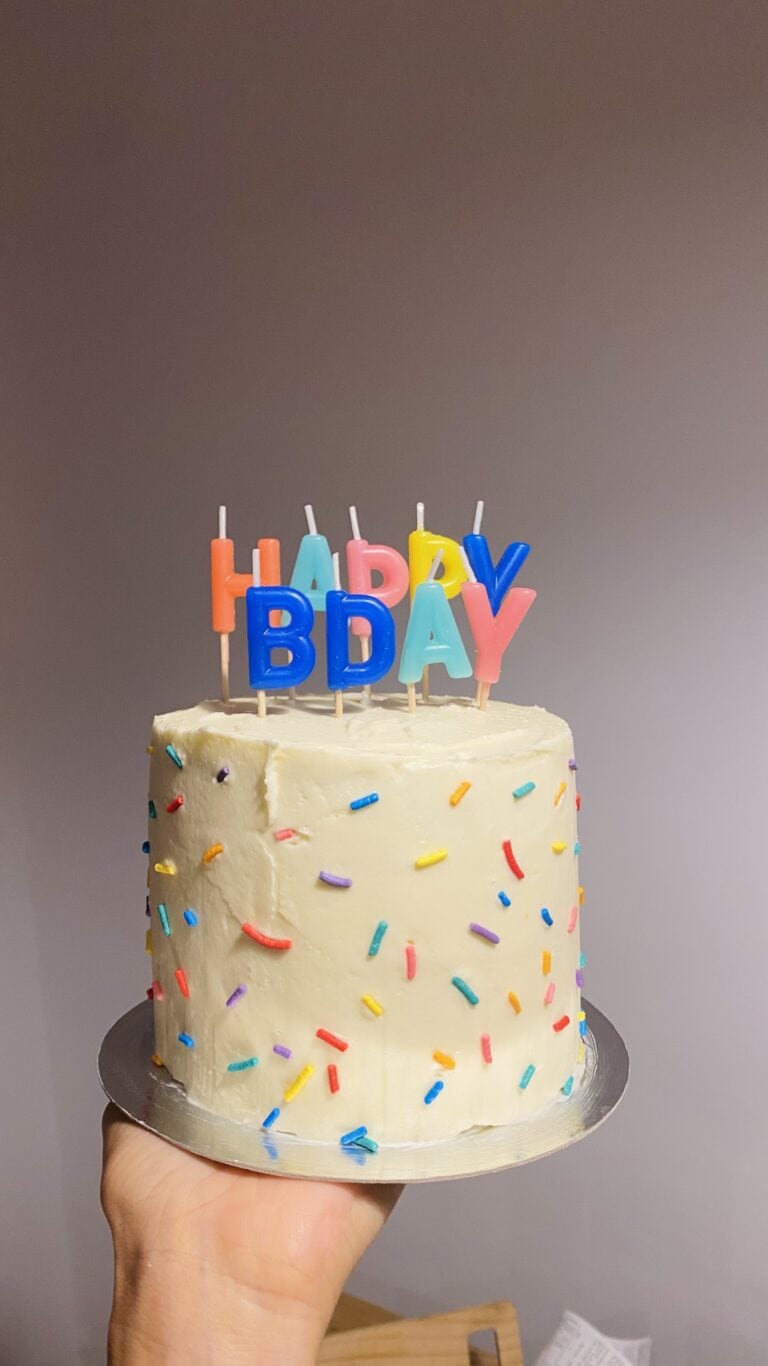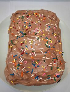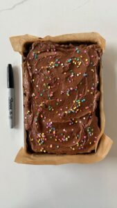 - Transfer the cake to a serving platter, or remove the parchment paper and return it to the pan. Add the buttercream on top and smooth as desired using an offset spatula. Add sprinkles if using. Transfer briefly to the fridge to allow the buttercream to firm up if needed. Bring to room temperature before serving.