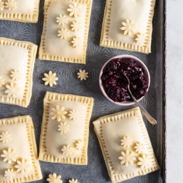 I made these just before we left for Canada as a way to use up a couple of things in my fridge - a brick of cream cheese, and half a jar of jam. I had some pie dough in the freezer, so I whipped up these little hand pies, and ohhhh man. I used the cream cheese to act as a bit of a dam to hold in the filling, and the combination of vanilla bean flavoured cream cheese, and sweet mixed berry jam filling is just so good. I didn’t add any additional sugar to the cream cheese, and the super flaky pie dough isn’t sweet, so the jam centre is so, so good against the slightly tangy cream cheese. These are crazy easy to make - they have serious pop tart vibes, and can very easily be scaled up to make a bunch. You could also do them as little circle hand pies rather than the rectangles, and another great thing about them is that you can freeze them ahead of time, store them in an airtight container in your freezer, and bake them off as you need.