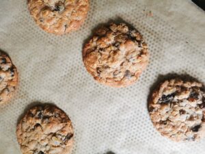 - Preheat the oven to 350°f / 180°c. Line two sheet pans with parchment paper for the cookies. Place the oats on an unlined baking sheet, and bake in the oven for 10-15 minutes, shaking often, until lightly golden. Remove from the oven and allow to cool, then weigh the cooled oats - you need 110g and the oats can lose some moisture in the oven so top up if needed.