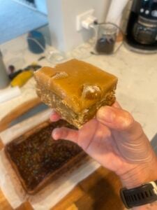 - Add the topping - While the base is baking, prepare the topping. It goes onto the hot base so make sure you keep an eye on what is going on. I usually start getting my things together about 10 minutes before the base is done. Then 5 minutes before the base is done, melt it all together. Add on top of the hot base.