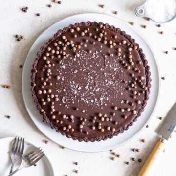 - If desired, finish the tart with chocolate crisp pearls and flaky sea salt.