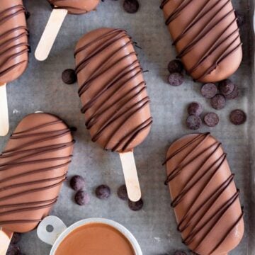 These Olive Oil Ice cream pops are made with a smooth, fruity olive oil ice cream, and finished with a milk chocolate magic shell and drizzled with dark chocolate.