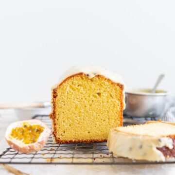 This passionfruit loaf cake has floral olive oil and a perfect texture from greek yogurt, and is brushed with a passionfruit syrup and finished with a passionfruit icing