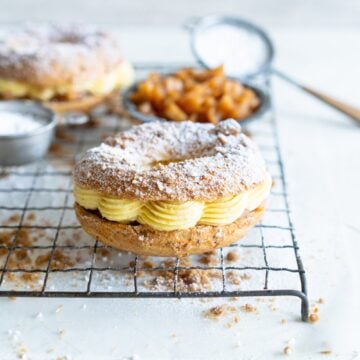 - Once the Paris Brest are cool, slice each in half using a serrated knife. Fill the bottom half of the paris brest with the spiced apple mixture. Pipe a round of mousseline cream onto the top of the apples - you can do this however you like, I piped a continuous round of little circles. Top with the second half of the Paris Brest.